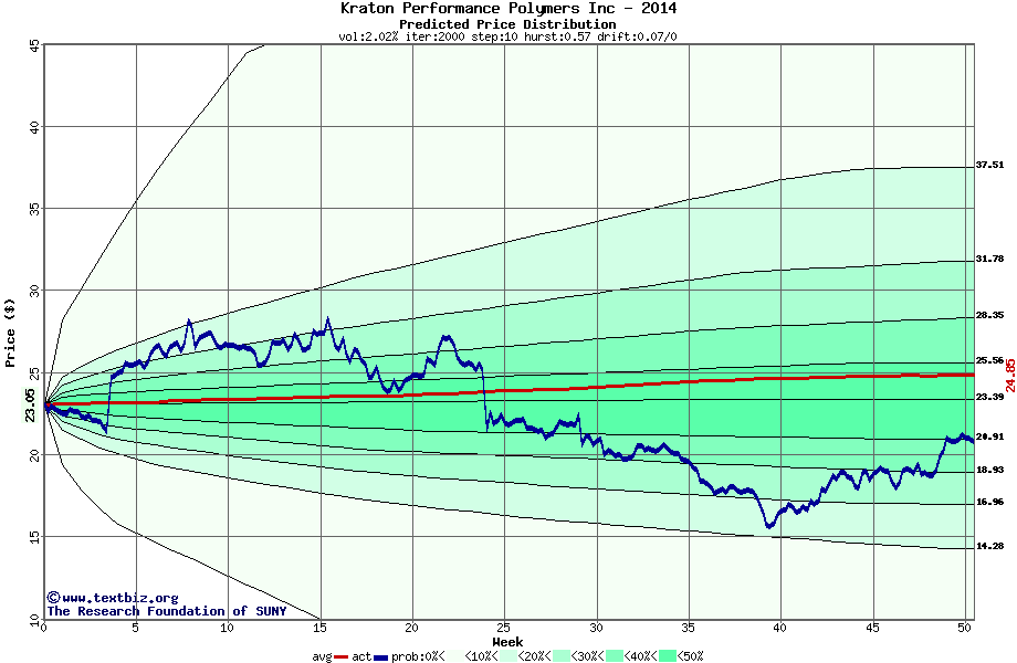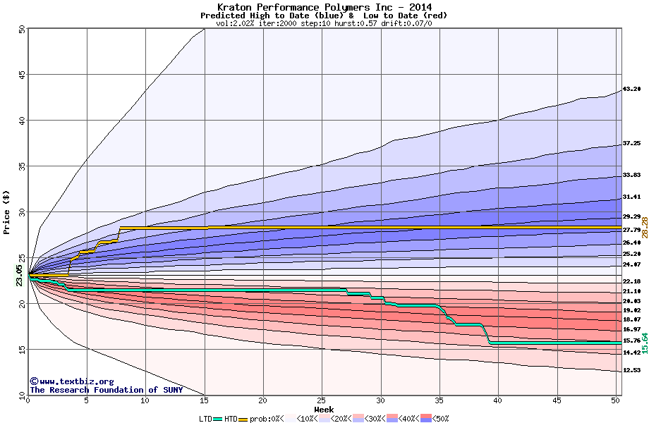The following graph plots the year-to-date performance of the stock for 2014 compared to the probability calculated by a random walk model.