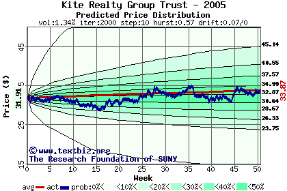 The following graph plots the year-to-date performance of the stock for 2005 compared to the probability calculated by a random walk model.