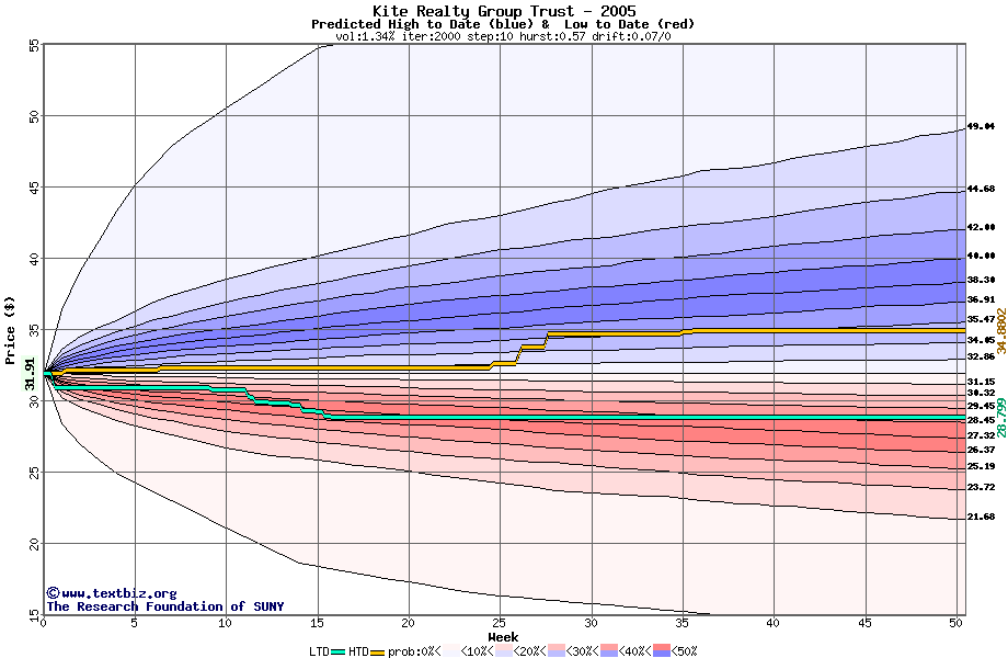 The high to date and low to date prices of the stock plotted against a random walk model for 2005 (what's this?).