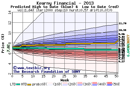 The high to date and low to date prices of the stock plotted against a random walk model for 2013 (what's this?).