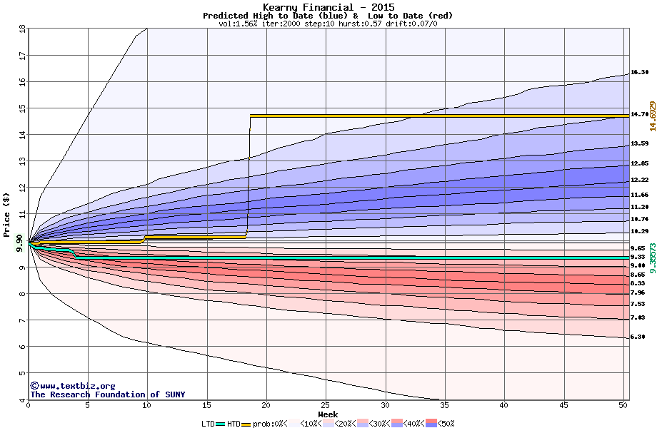 The high to date and low to date prices of the stock plotted against a random walk model for 2015 (what's this?).