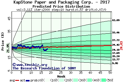 The high to date and low to date prices of the stock plotted against a random walk model for 2017 (what's this?).