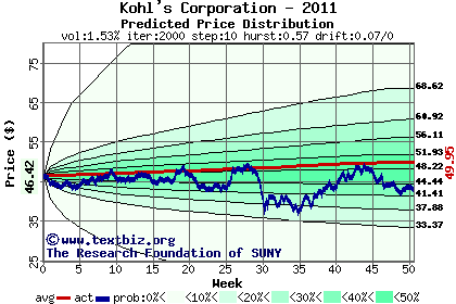 The high to date and low to date prices of the stock plotted against a random walk model for 2011 (what's this?).