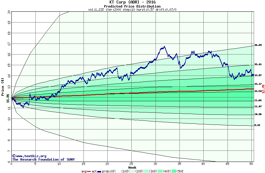 The high to date and low to date prices of the stock plotted against a random walk model for 2016 (what's this?).