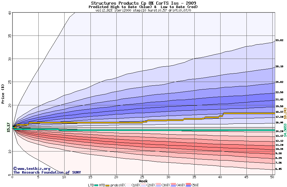 The high to date and low to date prices of the stock plotted against a random walk model for 2009 (what's this?).