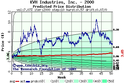 The high to date and low to date prices of the stock plotted against a random walk model for 2000 (what's this?).
