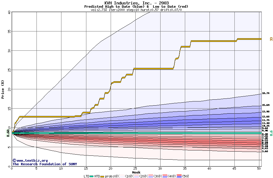 The high to date and low to date prices of the stock plotted against a random walk model for 2003 (what's this?).
