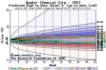 The high to date and low to date prices of the stock plotted against a random walk model for 2007 (what's this?).