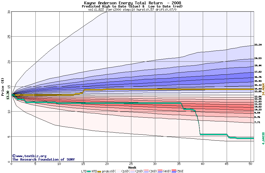 The high to date and low to date prices of the stock plotted against a random walk model for 2008 (what's this?).