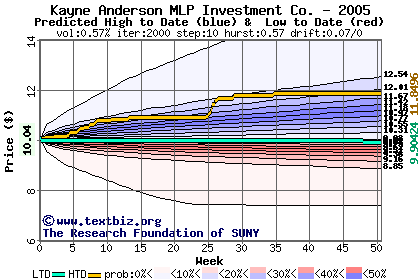 The high to date and low to date prices of the stock plotted against a random walk model for 2005 (what's this?).
