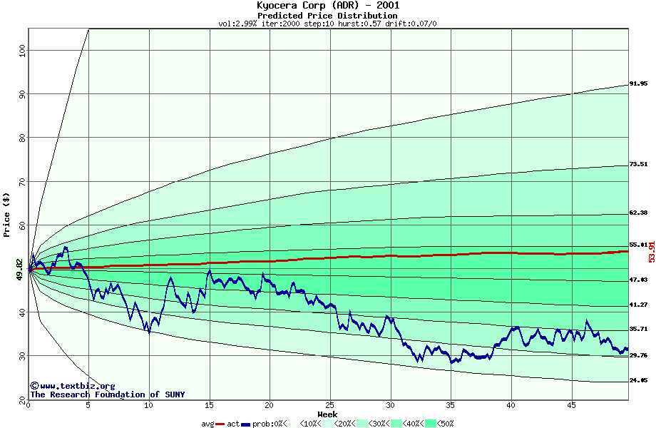 The following graph plots the year-to-date performance of the stock for 2001 compared to the probability calculated by a random walk model.