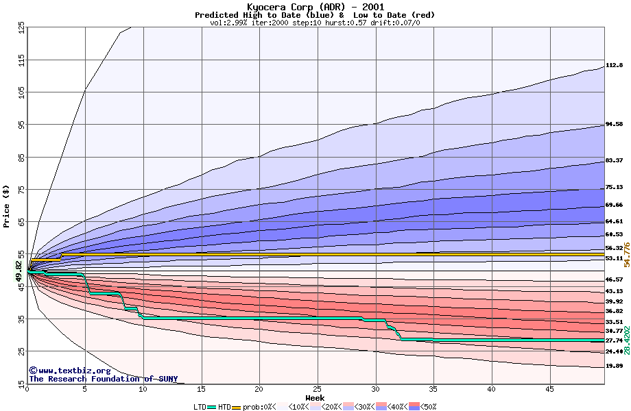The high to date and low to date prices of the stock plotted against a random walk model for 2001 (what's this?).