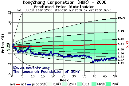 The high to date and low to date prices of the stock plotted against a random walk model for 2008 (what's this?).