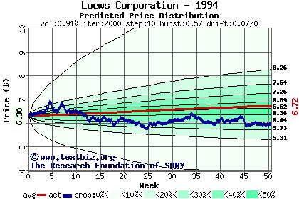 The high to date and low to date prices of the stock plotted against a random walk model for 1994 (what's this?).