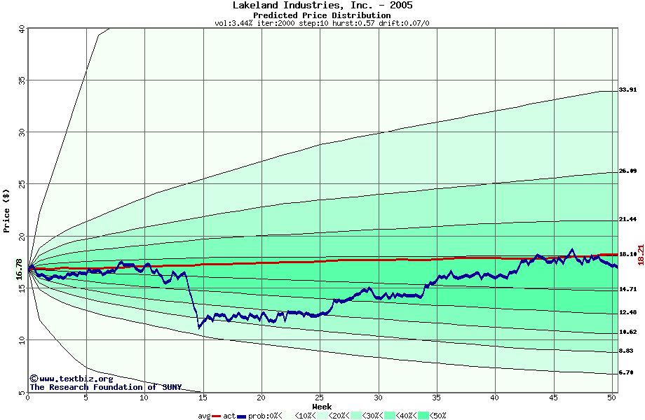 The following graph plots the year-to-date performance of the stock for 2005 compared to the probability calculated by a random walk model.