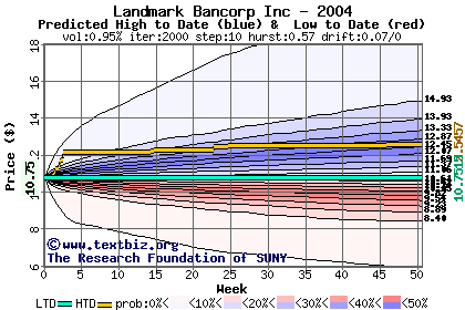 The high to date and low to date prices of the stock plotted against a random walk model for 2004 (what's this?).