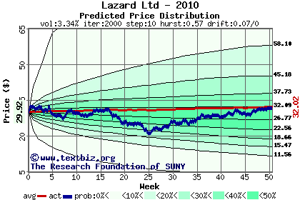The high to date and low to date prices of the stock plotted against a random walk model for 2010 (what's this?).