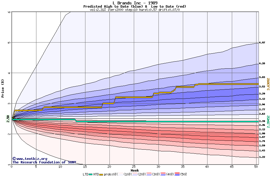 The high to date and low to date prices of the stock plotted against a random walk model for 1989 (what's this?).