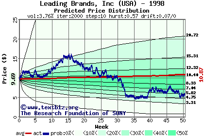 The high to date and low to date prices of the stock plotted against a random walk model for 1998 (what's this?).