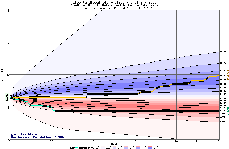 The high to date and low to date prices of the stock plotted against a random walk model for 2006 (what's this?).