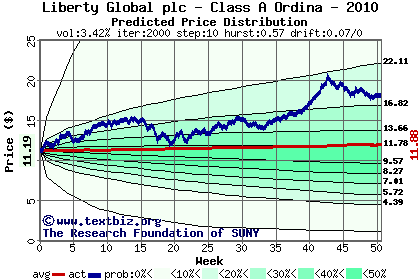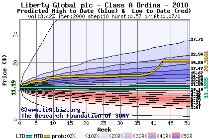 The high to date and low to date prices of the stock plotted against a random walk model for 2010 (what's this?).