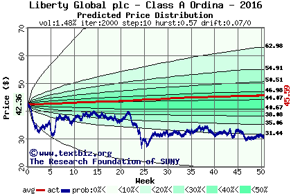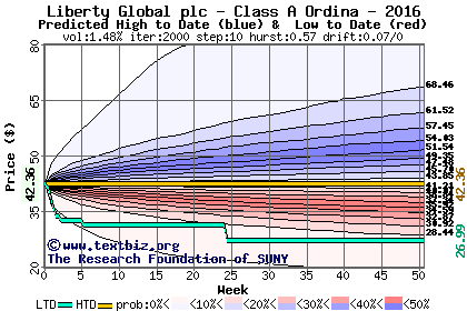 The high to date and low to date prices of the stock plotted against a random walk model for 2016 (what's this?).