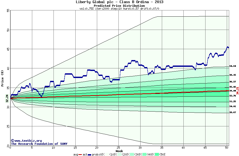 The following graph plots the year-to-date performance of the stock for 2013 compared to the probability calculated by a random walk model.