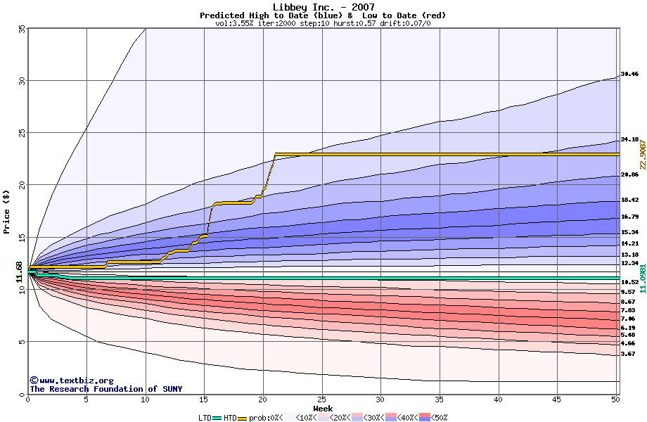 The following graph plots the year-to-date performance of the stock for 2007 compared to the probability calculated by a random walk model.
