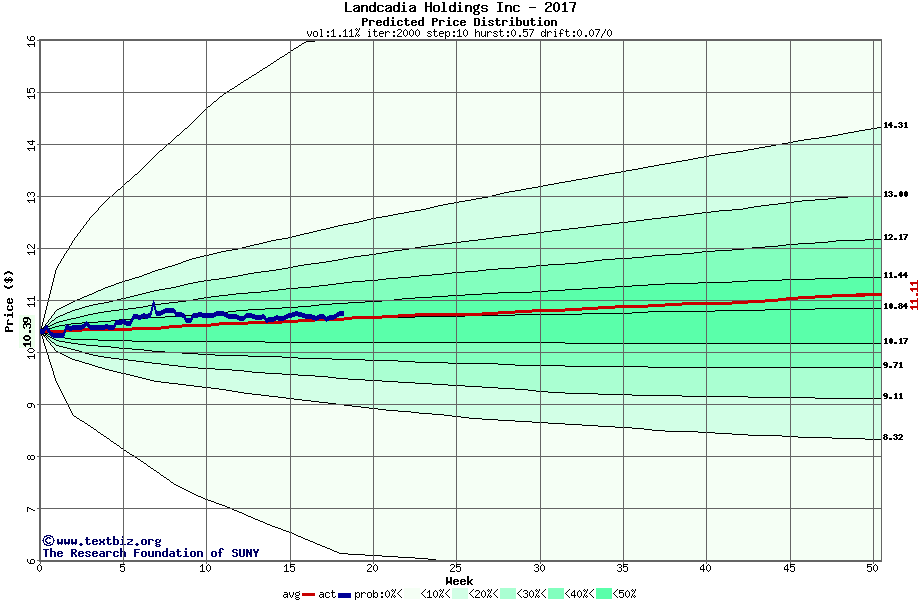 The high to date and low to date prices of the stock plotted against a random walk model for 2017 (what's this?).