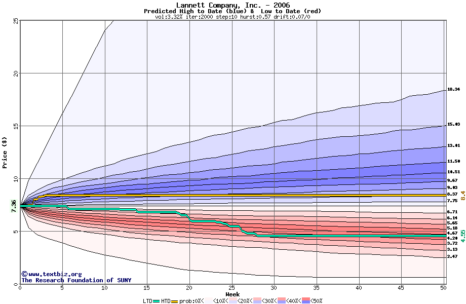 The high to date and low to date prices of the stock plotted against a random walk model for 2006 (what's this?).