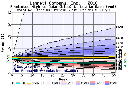 The high to date and low to date prices of the stock plotted against a random walk model for 2010 (what's this?).