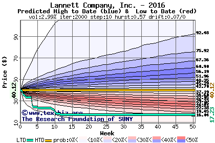 The high to date and low to date prices of the stock plotted against a random walk model for 2016 (what's this?).