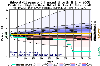 The high to date and low to date prices of the stock plotted against a random walk model for 2008 (what's this?).