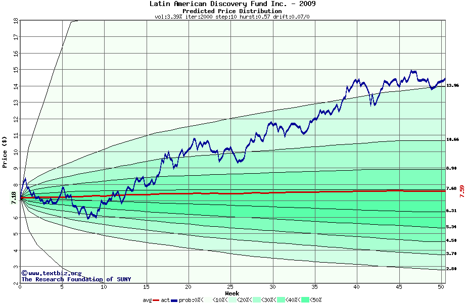 The following graph plots the year-to-date performance of the stock for 2009 compared to the probability calculated by a random walk model.