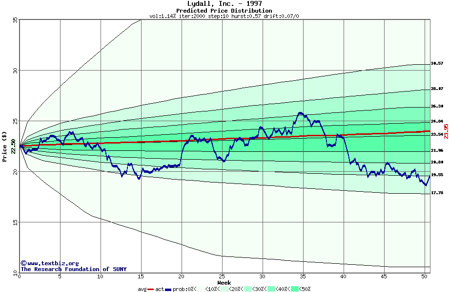 The following graph plots the year-to-date performance of the stock for 1997 compared to the probability calculated by a random walk model.