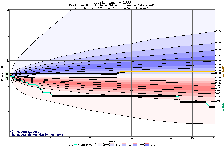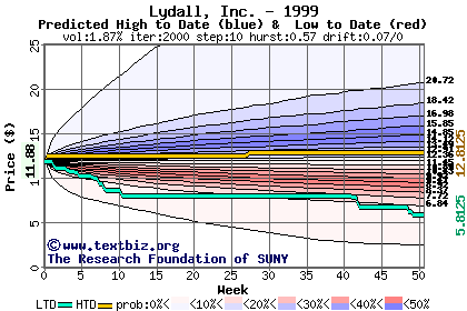 The high to date and low to date prices of the stock plotted against a random walk model for 1999 (what's this?).