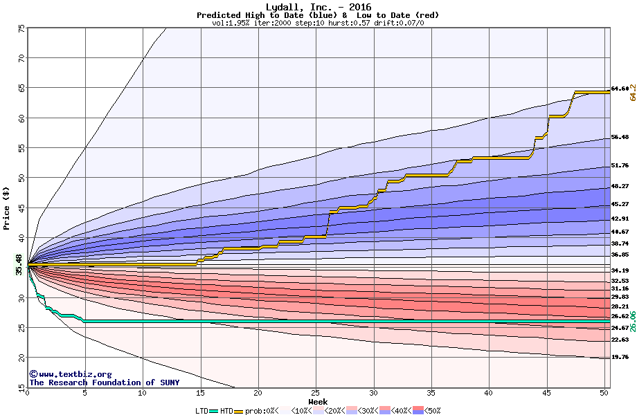 The high to date and low to date prices of the stock plotted against a random walk model for 2016 (what's this?).