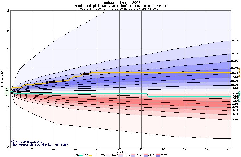 The high to date and low to date prices of the stock plotted against a random walk model for 2002 (what's this?).
