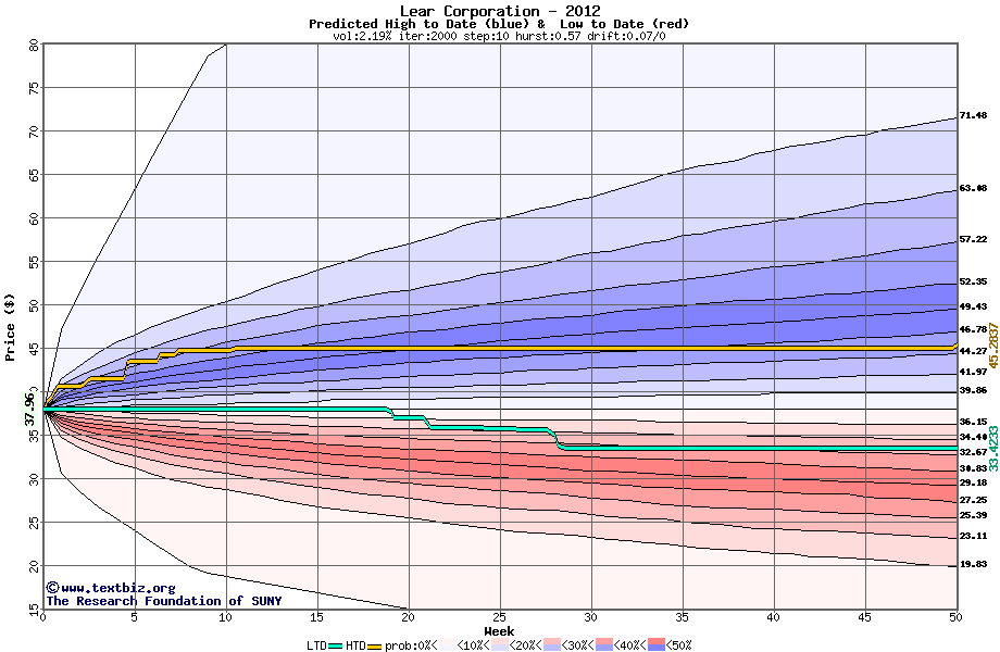 The high to date and low to date prices of the stock plotted against a random walk model for 2012 (what's this?).
