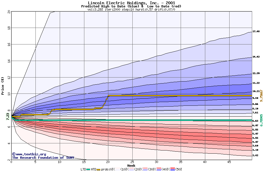 The high to date and low to date prices of the stock plotted against a random walk model for 2001 (what's this?).