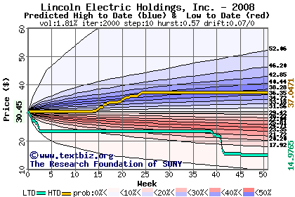 The high to date and low to date prices of the stock plotted against a random walk model for 2008 (what's this?).