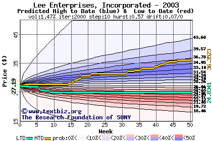 The high to date and low to date prices of the stock plotted against a random walk model for 2003 (what's this?).