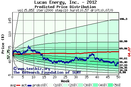 The high to date and low to date prices of the stock plotted against a random walk model for 2012 (what's this?).