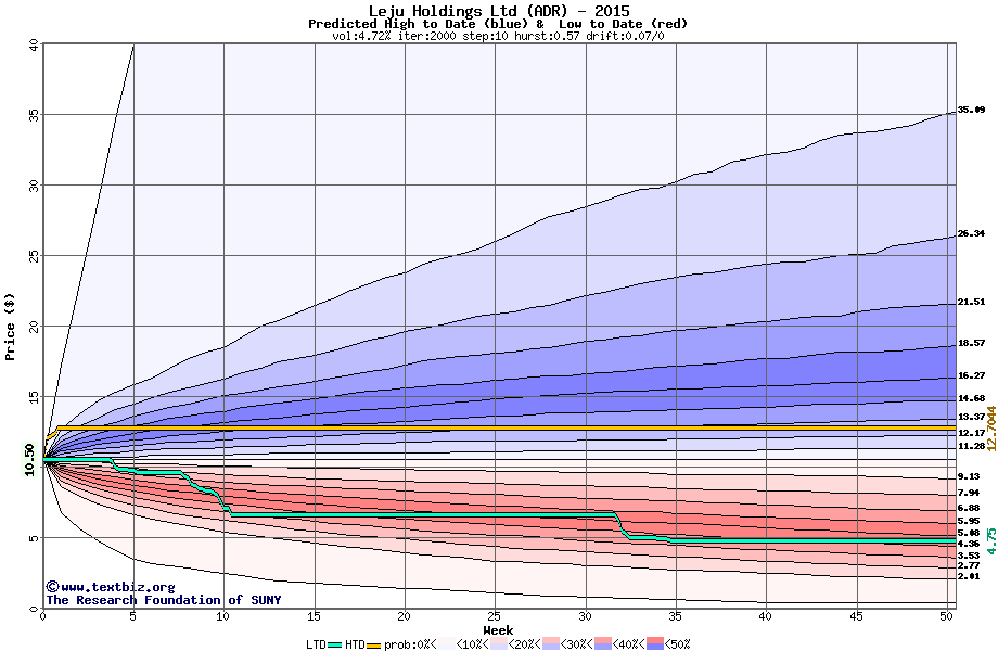 The high to date and low to date prices of the stock plotted against a random walk model for 2015 (what's this?).