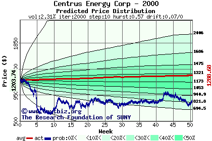 The high to date and low to date prices of the stock plotted against a random walk model for 2000 (what's this?).