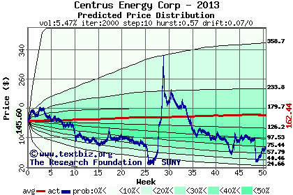 The high to date and low to date prices of the stock plotted against a random walk model for 2013 (what's this?).