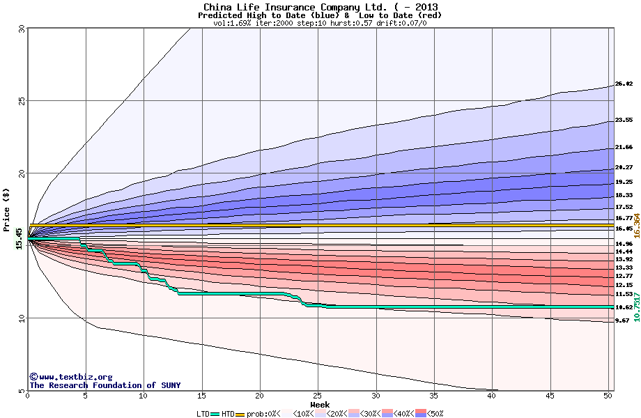 The high to date and low to date prices of the stock plotted against a random walk model for 2013 (what's this?).