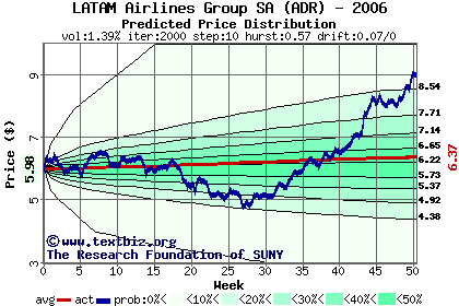 The high to date and low to date prices of the stock plotted against a random walk model for 2006 (what's this?).