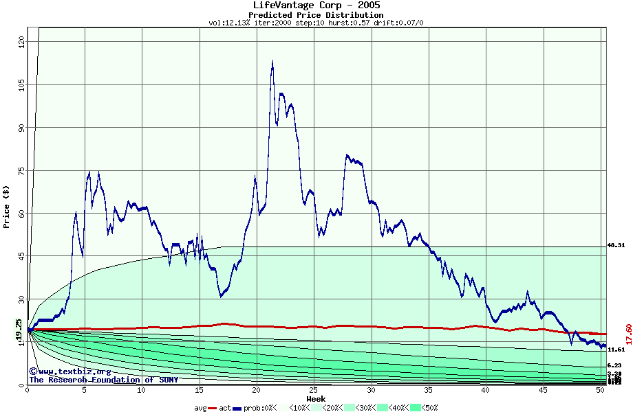 The following graph plots the year-to-date performance of the stock for 2005 compared to the probability calculated by a random walk model.