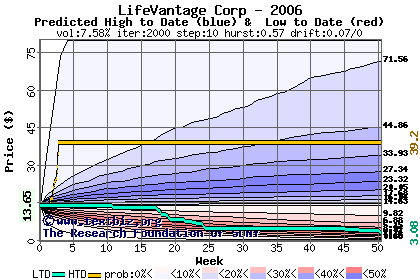 The high to date and low to date prices of the stock plotted against a random walk model for 2006 (what's this?).
